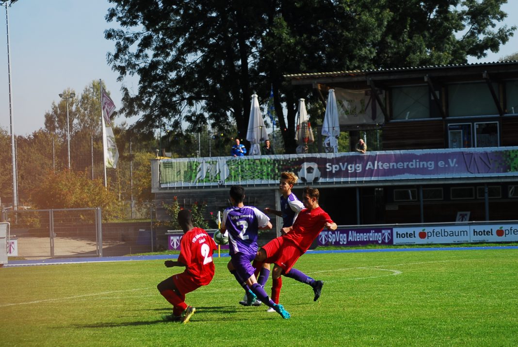 Im Duell der beiden bis dato verlustpunktfreien Teams behielten die A1-Junioren der SpVgg Altenerding gegen den VfB Hallbergmoos letztendlich deutlich mit 3:0 die Oberhand. Aber trotz des klaren Erfolges war im Lager der Hausherren nur bedingt zufrieden, denn man zeigte lediglich eine durchschnittliche Leistung und die Laufbereitschaft war nicht wie erhofft. Allerdings stand die Defensive sehr gut, sodass Torhüter Robin Schmid einen geruhsamen Tag hatte und nahezu beschäftigungslos blieben. Nach etwas mehr als 10 Minuten hatten die Gastgeber den frühen Führungstreffer auf dem Schlappen. Mert Gül hatte sich nach innen durchgetankt und bediente dann den durchstartenden Kerim Özdemir mustergültig, doch alleine vor dem Tor stehend scheiterte der Torjäger am Hallbergmooser Schlussmann. Auch die nächste Möglichkeit lag auf Seiten der Gastgeber. Nach einem Zuspiel von Simon Zerndl legte Maximilian Meurer für Giulio Vicari ab, doch dessen Schuss konnte ein Verteidiger noch entscheidend abfälschen, sodass der Ball knapp am Gehäuse vorbeiging. Kurz vor der Pause sollte den Veilchen dann der Führungstreffer gelingen und dabei profitierte man auch von einer unglücklichen Figur das Gästekeepers. Nach einem Foul brachte Ömer Altinisik die Kugel aus fast 30 Metern auf das Tor und der Schlussmann musste den Flachschuss zum 0:1-Rückstand passieren lassen. Im zweiten Durchgang wäre der SpVgg dann nach acht Minuten fast der zweite Treffer geglückt. Nach einem groben Ballverlust des VfB spielte Özdemir die Kugel nach innen auf Mert Gül. Er machte noch einen Haken um seinen Gegenspieler und kam dann zum Abschluss, doch ein Verteidiger konnte mit letztem Einsatz den Ball, der wohl ins Tor gegangen wäre, abgeblockt. Wenig später zeigte sich dann der VfB erstmals gefährlich vor dem Tor der SpVgg, doch ein am langen Pfosten freistehender Akteur köpfte das Leder am Tor vorbei. Drei Minuten später wurde es dann nochmal gefährlich, doch ein Freistoß aus 23 Metern ging knapp am Pfosten vorbei, wobei Schlussmann Robin Schmid wohl hätte retten können. 20 Minuten vor dem Ende konnten die Gastgeber dann den Vorsprung ausbauen. Nach einer schönen Kombination über die rechte Seite brachte Corbinian Prell das Leder vor das Tor und Meurer kam mit dem langen Bein an die Kugel und drückte halbhohe Hereingabe aus kurzer Entfernung mit einer Art „Kung-Fu-Tritt“ über die Linie. Zehn Minuten vor dem Ende wäre die Partie dann fast noch einmal spannend geworden. Nach einer Flanke landete die Kopfballabwehr von Willi Gereke genau bei einem Gästespieler, der aus acht Metern völlig frei zum Schuss kam, doch zum Glück hatte er sein Visier zu hoch eingestellt und schoss deutlich über den Kasten. Dann waren wieder die Altenerdinger an der Reihe und fünf Minuten vor dem Ende war man der Entscheidung sehr nahe. Simon Zerndl hatte sich auf der linken Seite hervorragend durchgesetzt und brachte dann die Kugel, die noch leicht abgefälscht war nach. Leider verpasste der freistehende Prell das Leder, das letztendlich knapp am langen Pfosten vorbeiging, um Zentimeter. Doch in der letzten Minute legten die Veilchen dann doch noch den dritten Treffer nach, denn nach einem Foul an Kerim Özdemir entschied der Referee Arno Schuster auf Elfmeter. Der Gefoulte übernahm die Verantwortung, scheiterte aber zunächst am VfB-Keeper. Jedoch konnte er die Kugel nicht festhalten, sodass Özdemir im Nachschuss für den 3:0-Endstand sorgte. Trotz der Übernahme der Tabellenführung zeigte sich Trainer Andreas Heilmaier nur bedingt zufrieden. „Wir haben heute keinesfalls unsere beste Leistung gezeigt und wir müssen uns künftig in jedem Fall wieder steigern, um unsere Saisonziele zu erreichen. Wir haben vor allem im Mittelfeld zu wenig Laubereitschaft gezeigt, sodass die Abwehr zu langen Bällen gezwungen wurde. Letztendlich hat das Ergebnis gestimmt, aber wir müssen mit unserem Auftritt selbstkritisch umgehen und dürfen keinesfalls ein zu beobachtende Selbstzufriedenheit dulden“.