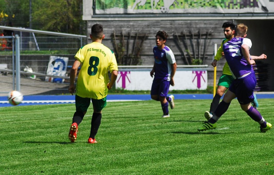 Nach knapp 70 Minuten wurde das Derby der A2-Junioren zwischen der SpVgg Altenerding und der JFG Sempt Erding beim Spielstand von 4:0 für die Veilchen vom gut leitenden Schiedsrichter Kevin Jovi abgebrochen. Aber dies hatte nichts mit Undiszipliniertheiten der beiden Kontrahenten zu tun, sondern vielmehr war es dem Spielermangel der Erdinger geschuldet. Das Team von Trainer Tobias Hilbig reiste mit nur 8 Mann an und man muss die Einstellung der Erdinger absolut loben, denn man sagte das Spiel nicht ab, sondern stellte sich trotz der erheblichen Schwächung der Unterzahl. Die Gastgeber nahmen das Match anfangs zu leicht, denn mit unnötigen Einzelleistungen und überwiegend langen Bällen nutzte man die Vorteile der numerischen Überlegenheit nicht aus. Ganz im Gegenteil waren die dezimierten Gäste das Team mit den besseren Möglichkeiten. Nach fünf Minuten wäre die JFG dann sogar fast in Front gegangen. Nach einem langen Ball lief ein Angreifer von der linken Seite in den Strafraum und kam dann aus 10 Metern zum Schuss, doch der leicht abgefälschte Ball landete nur im Außennetz. Auch diese Chance war für die Hausherren zunächst kein Weckruf, denn weiterhin spielte man zu pomadig und langsam, sodass sich die Erdinger Abwehr immer wieder formieren konnte und klare Möglichkeiten der Gastgeber zunächst ausblieben. Zwar hatten die Hausherren ein optisches Übergewicht, aber es wurde zu umständlich und kompliziert gespielt. So musste dann auch ein Standard herhalten, um die Altenerdinger Führung zu bringen. Eine Ecke von Felix Meier landete bei dem hinter dem langen Pfosten lauernden Johannes Rüdiger. Der nahm die Hereingabe an, zog nach etwas nach innen, ehe er dann mit einem Flachschuss ins Eck traf. Auch die nächste Chance resultierte aus einem Eckball, doch diesmal hatte der aufgerückte Marc Florian Pech, dass sein Volleyschuss knapp das Ziel verfehlte. 12 Minut4en vor der Pause ließen die Gastgeber aber dann doch den nächsten Treffer folgen. Diesmal zog der eingewechselte Samuel Morales das Leder von der rechten Angriffssseite nach innen und fand Felix Reiser, der mit einem trockenen Schuss aus 12 Metern erfolgreich war. Aber die Gäste versuchten weiterhin zu ihren Chancen zu kommen, was bei der teilweise leichtfertig agierenden Defensive der SpVgg durchaus möglich war. Kurz vor der Pause wurde die Hintermannschaft mit einem langen Ball aus den Angeln gehoben, doch Schlussmann Markus Weißacher war aufmerksam, kam aus seinem Tor und konnte das Leder gerade noch vor dem heranstürmenden Erdinger Stürmer per Kopf klären. Sodass die Seiten mit einer 2:0-Führung für die Gastgeber gewechselt wurden. Nach Wiederbeginn agierten die Gastgeber zunächst konzentrierter und nach wenigen Augenblicken wäre fast das 3:0 gefallen. Nach einem Doppelpass zwischen Marc Florian und Christan Wünsch kam Erstgenannter im Strafraum zum Abschluss, doch die Kugel ging um wenige Zentimeter am Tor vorbei. Wenig später hatte sich dann Felix Meier auf der linken Seite durchgesetzt, tauchte alleine vor dem Erdinger Schlussmann auf, der jedoch zur Ecke abwehren konnte. Während er in dieser Szene prächtig reagierte, hatte er beim dritten Treffer der Veilchen maßgeblichen Anteil, denn er ließ einen harmlosen Schuss von Morales zur endgültigen Entscheidung passieren. Nun merkte man den Gästen dann mehr und mehr den Kräfteverschleiß an und man konnte sich nur noch durch Befreiungsschläge wehren, aber trotz allem war der JFG eine tolle Moral nicht abzusprechen, denn trotz der Aussichtslosigkeit in diesem ungleichen Duell kämpfte man weiter. Nach 68 Minuten war jedoch der vierte Gegentreffer dann nicht mehr zu verhindern. Nach einer weiteren Ecke von Meier kam U17-Spieler Felix Wögigner am langen Pfosten stehend an den Ball. Er umkurvte noch seinen Gegenspieler und zirkelte das Spielgerät dann unhaltbar ins lange Eck. Bei dieser Aktion hatte sich der Erdinger Keeper leicht verletzt und konnte die Partie nicht mehr fortsetzen. Dies nahmen die Gäste dann zum Anlass, um den Schiedsrichter um eine Spielabbruch zu bitten. Kevin Jovi kam dieser Aufforderung nach und schickte beide Teams vorzeitig unter die Dusche, sodass nun ein Sportgerichtsurteil über den Ausgang entscheiden muss, wo eine Spielwertung zu Gunsten der Veilchen mit größter Wahrscheinlichkeit zu erwarten ist.