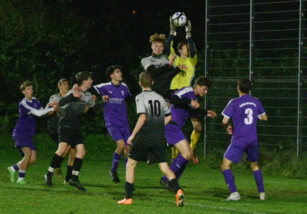 Nach zuletzt zwei Siegen in Serie mussten sich die Altenerdinger A2-Junioren im Heimspiel gegen die SG Wörth beim 2:2 mit einer Punkteteilung nach 90 Minuten zufrieden geben. Dabei sah es zunächst danach aus als sollte man den Erfolgslauf fortsetzen können, denn nach sechs Spielminuten gingen die Veilchen mit ihrer ersten Chance bereits in Führung. Ramo Pervitz setzte sich auf der linken Seite nach einem Steilpass im Laufduell mit seinem Gegenspieler durch und spitzelte das Leder am herauseilenden Wörther Keeper vorbei zum 1:0 in die Maschen der Gäste. Fast hätte der Flügelstürmer nur eine Minute später noch einen draufgesetzt. Abermals behielt Ramo Pervitz auf der linken Seite die Oberhand, doch diesmal wurde sein Flachschuss noch von einem Wörther Defensivspieler abgefälscht. Allerdings gaben die Hausherren diesen Vorteil alsbald wieder aus der Hand. Nach mehrfachen halbherzigen Klärversuchen eines Angriffs der Gäste auf der rechten Seite, drang der Wörther Rechtsaußen in den Strafraum der Lila-Weißen ein, legt das Leder quer in die Mitte, wo ein mitgelaufener Mitspieler den Ball ohne Probleme am chancenlosen Nico Brendel vorbei aus kurzer Distanz einnetzte. Der Treffer zeigte Wirkung, denn in der Folge waren die Gäste zunehmend spielbestimmend. Nach einer Viertelstunde stand den Semptstädtern das Glück zur Seite. Ein Freistoß von der rechten Seite aus dem Halbfeld wurde immer länger und senkte sich über Keeper Nico Brendel an den langen Pfosten, sprang jedoch ins Feld zurück, so dass auch der Nachschuss verpuffte. Fünfzehn Minuten später musste der Anhang der Lila-Weißen erneut kräftig durchatmen. Eine Flanke von rechts erreichte einen Wörther Stürmer am Fünfer, der das Leder jedoch nur unsauber traf und Nico Brendel die Situation noch entschärfen konnte. Fast aus dem Nichts heraus wären die Veilchen nach 35 Minuten wieder in Führung gegangen. Einen haarsträubenden Fehlpass im Spielaufbau der Gäste nahm Emilio Polsfuss gut 25 Meter vor dem Wörther Tor auf, ließ sich im Laufduell aber von einem Verteidiger etwas abdrängen. Nach einem kurzen Haken fand er jedoch den mitgelaufenen Yousef Trakuri, der am Fünfer, statt sofort abzuschließen, noch versuchte den Torwart auszuspielen, was dazu führte, dass er die Kugel schließlich neben den Kasten setzte. Die Gäste drückten indes unbeirrt weiter. Nach einem Ballverlust im Spielaufbau konnte Suljo Handanagic zunächst noch mit einer Grätsche den Ball vor einem einschussbereiten Wörther Stürmer am Fünfer klären. Die nachfolgende Ecke segelte in den Strafraum, wo nach einem Getümmel das Leder zentral zu einem Wörther Spieler kam, der jedoch den Ball aus sieben Metern weit über die Querlatte drosch. Zwei Minuten nach dem Wechsel gab es einen Eckstoß auf der anderen Seite. Doch Emilio Polsfuss setzte am langen Eck einen Kopfball knapp neben das Gehäuse. Die Gäste überzeugten weiterhin durch sichere Ballstafetten, welchen man jedoch auch zu viel Raum im Mittelfeld überließ. So ging die SG Wörth nach 70 Minuten nicht unverdient in Front. Die Gäste setzten sich im Doppelpassspiel zentral vor dem Altenerdinger Tor durch, so dass der durchgebrochene Stürmer den Ball im Sechzehner nur noch am chancenlosen Nico Brendel ins lange Eck zum 2:1 einschieben musste. Die Hausherren warfen nun alles nach vorne, wobei vieles hektisch und Stückwerk blieb. Zunächst haderten die Semptstädter mit einer Schiedsrichterentscheidung, denn nach einem Schubser im Strafraum gegen Emilio Polsfuss blieb die Pfeife des Unparteiischen stumm. Aber der Wille das Spiel nochmals zu drehen war allseits vorhanden. Zwei Minuten vor dem regulären Ende sollte das Anrennen der Veilchen doch noch belohnt werden. Ein langer Schlag aus der eigenen Hälfte fand den rechts durchstartenden Yousef Trakuri, der das Leder an der Strafraumkante über den Wörther Keeper ins Netz zum umjubelten Ausgleich versenkte. Fast wäre den Altenerdingern noch der Lucky Punch gelungen. In der Nachspielzeit kam Sebastian Kähler-Pardo auf der halbrechten Seite an den Ball und versuchte sein Glück mit einem Heber, der nur knapp hinter dem Querbalken der Gäste sein Ziel verfehlte. Letztlich musste man aufgrund des Spielverlaufs mit der Punkteteilung zufrieden sein, wobei der hervorzuhebende nimmermüde Kampfgeist des Teams den Teilerfolg ermöglichte.