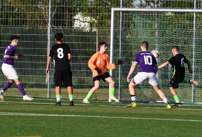 Mit einem klaren und ungefährdeten 3:0-Erfolg meldeten sich die D1-Junioren der SpVgg nach der Osterpause wieder in den Spielbetrieb zurück und nach diesem dreifachen Punktgewinn bleibt man dem Tabellenführer FT Ingolstadt-Ringsee, der derzeit einen Zähler mehr auf dem Konto hat, auf den Fersen. Die Gastgeber starteten furios und schon nach sechs Minuten gelang den Veilchen die wichtige 1:0-Führung. Nach einem Pass von Paul Schiwietz setzte sich Michael Melissourgos auf dem Flügel durch, drang in den Strafraum ein und ließ dem Echinger Keeper mit einem platzierten Schuss ins Eck nicht den Hauch einer Abwehrchance. Nach diesem Treffer blieb die SpVgg spielbestimmend und um ein Haar hätte man nach 12 Minuten dann schon den zweiten Treffer für sich verbuchen können. Als Noah Memed das Leder aus dem linken Halbfeld in Zentrum beförderte, verfehlte Schiwietz die Hereingabe um wenige Zentimeter. Allerdings irritierte er den aus seinem Tor kommenden Schlussmann, so dass auch der Torhüter den Ball verfehlte, aber letztlich hatte er dann das notwendige Glück, denn die Kugel ging um Haaresbreite am langen Pfosten vorbei ins Aus. In der Folgezeit blieb zwar das optische Übergewicht auf Seiten der Semptstädter, aber in der Offensive war man zunächst nicht zwingend genug, so dass in der nächsten Phase klar Einschussmöglichkeiten hüben wie drüben Mangelware blieben. Nach 26 Minuten mussten die Gastgeber dann zumindest ein wenig zittern, denn nach einem Foul wurde Eching aus etwa 15 Metern ein Freistoß in zentraler Position zugesprochen. Aber das Bangen hielt nur kurz an, denn der Echinger Schütze hatte sein Visier deutlich zu hoch eingestellt, so dass Keeper Felsner nicht zum Eingreifen gezwungen wurde. Kurz vor dem Pausenpfiff boten sich der SpVgg auf der anderen Seite noch zwei hervorragende Chancen, die aber nicht zum erhofften Erfolg führten. Nach einem schönen Spielzug, bei dem das Spiel von der linken schön auf die rechte Seite verlagern konnte, brachte Melissourgos die Kugel nach innen und fand im Zentrum Schiwietz, der mit der Fußspitze noch an den Ball kam, aber das Spielgerät knapp über den Kasten setzte. Nur Sekunden später hätte die Torjäger dann aber den zweiten Treffer nachlegen müssen. Nach einem hervorragenden Pass von Leó Dasch hatte Schiwietz nur noch den Echinger Keeper vor sich, doch anstatt, das Leder flach ins Eck zu schieben, suchte er den Abschluss mit Gewalt. Allerdings ging der Schuss dann genau auf den Torwart, so dass man „nur“ mit einer 1:0-Führung in die Halbzeit ging. Was man kurz vor der Pause versäumt hatte, holte man aber dann drei Minute nach Wiederbeginn nach und man kam zum beruhigenden zweiten Treffer. Nach einer hervorragenden Kombination legte Melissourgos nach Zuspiel von Philipp Feuker auf den im Strafraum links freistehenden Timo Wegener ab, der direkt auf Emil Fernandez Jackisch ablegte, und der Torjäger, der frei vor dem Echinger Tor zum Abschluss kam, ließ sich nicht zweimal bitten und netzte unhaltbar in die linke Ecke ein. Fünf Minuten später hätte der Torschütze dann fast für die Vorentscheidung gesorgt. Als sich Melissourgos auf der rechten Seite einmal mehr gegen seinen Gegenspieler durchgesetzt hatte, brachte er das Spielgerät in den Rücken er Abwehr, wo Emil Fernandez Jackisch an der Strafraumgrenze zum Schuss kam, doch der Ball, der für den TSV-Torwart unerreichbar gewesen wäre, ging um Zentimeter am Tor vorbei. Nun erarbeiteten sich die Gastgeber eine eindeutige Dominanz und mehr dem dritten Treffer deutlich näher als die Zebras dem Anschlusstor. Vier Minuten später brannte es schon wieder im Echinger Strafraum, doch Melissourgos, der nach einer Feuker-Flanke sofort abschloss, zielte leider etwas zu hoch. Wenig später wurde die Partie dann von einer womöglich schweren Verletzung von Andreas Neumann überschattet. Als er in Richtung Strafraum ging, knickte er nach einem Sprung ohne gegnerische Einwirkung unglücklich um, so dass er mit einer Sprunggelenksverletzung den Platz verlassen musste. Wir wünschen dem Unglücksraben auf diesem Wege gute Besserung. Anschließend fanden die Gäste dann etwas besser ins Spiel, aber die Altenerdinger Defensive stand sehr sicher und ließ nichts zu, so dass Eching eigentlich zu keiner zwingenden Chance kam und Torhüter Tobias Felsner einen ruhigen Abend verbringen konnte. Nur einmal drohte der Anschlusstreffer. Als man das Leder im Spielaufbau leichtfertig vertändelte, kam ein Echinger Akteur frei vor dem Altenerdinger Tor an die Kugel, doch er war scheinbar zu überrascht, so dass sein Abschluss ausbaufähig war und von Felsner entschärft werden konnte. Sein Gegenüber musste kurz vor dem Ende dann nochmals hinter sich greifen, wobei er bei diesem Traumtor absolut chancenlos war. Als Noah Memed ein Zuspiel von Schiwietz aufnahm, umspielte er noch einen vor ihm stehenden Gegenspieler, ehe er dann das Spielgerät punktgenau zum 3:0-Endstand im Winkel des langen Ecks versenkte.