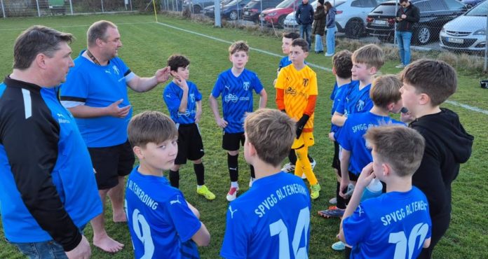 Die A1-Junioren der SpVgg zeigten sich auch im zweiten Saisonspiel von ihrer besten Seite und ließen im Landkreisderby den Gästen aus Forstern/Hohenlinden nicht den Hauch einer Chance, so dass der deutliche 4:0-Sieg eher noch der SG schmeichelte. Während die Gäste in der Vorrunde bei der knappen 0:1-Niederlage gegen die SpVgg fast noch auf Augenhöhe agiert hatten, war diesmal ein Klassenunterschied ersichtlich. Dabei begann das Match mit einer Schrecksekunde für den Veilchen, denn schon nach einer Spielminute drohte den Hausherren der Rückstand. Nach einem langen Ball konnte die Abwehr der Gastgeber den hohen Ball nicht klären, so dass ein SG-Angreifer im Strafraum frei vor dem Tor zum Abschluss kam, doch zumindest war Keeper Senal da Silva hellwach und konnte den Ball entschärfen, ehe dann Gentian Hoti mit einem Befreiungsschlag die prekäre Situation entschärfen konnte. Nur eine Minute später kombinierten sich die Veilchen über Jannik Obermaier und Artin Recica nach vorne und als die Kugel dann bei Benjamin Veladzic im Strafraum landete, wurde er von seinem Gegenspieler von hinten gestoßen. Allerdings schloss er im Taumeln noch ab, so dass die Entscheidung des Referees, nicht auf Elfmeter zu entscheiden, wohl richtig war. Nach 23 Minuten blieb dem Unparteiischen aber keine andere Möglichkeit, als auf den Punkt zu zeigen. Nach einem schönen Pass von Recica lief Lukas Rymas von der rechten Seite in den Strafraum und als der SG-Keeper, der im Verlauf der Partie zum besten Akteur seiner Farben wurde, aus dem Tor kam, legtes der Angreifer das Leder an ihm vorbei und dem Schlussmann blieb keine andere Chance, als seinen Kontrahenten unfair zu Fall zu bringen, so dass diesmal sofort der Elfmeterpfiff ertönte. Recica übernahm die Verantwortung und schoss auf das rechte Eck, hatte dann aber sogar noch etwas Glück, denn Torhüter verfehlte das Leder nur um Zentimeter, konnte aber trotzdem den ersten Gegentreffer nicht verhindern. Dieser Treffer verlieh der SpVgg Selbstvertrauen, so dass man nun eindeutig das Zepter in der Hand hatte und die Partie eindeutig diktierte. Da sich nun auch größere Lücken in der Abwehr der Gäste auftaten, konnten die Hausherren schon zehn Minuten später die Führung ausbauen. Als der Innen- und Außerverteidiger weit auseinanderstanden, ergab sich für Obermaier die Möglichkeit, das Leder durch die Gasse zu spielen, wo Benjamin Veladzic das Zuspiel aufnahm und unhaltbar für den Keeper zum wichtigen 2:0 „einnetzte“. Fünf Minuten vor der Pause trugen die Gastgeber das Leder schön nach vorne und das Spiel von der linken auf die rechte Seite verlagert wurde, bewies Rymas eine glänzende Übersicht, denn er legte auf den gut positionierten Benjamin Veladzic ab, doch sein Schuss war ausbaufähig und sorgte für keine große Gefahr. In den letzten Minuten vor der Pause waren die Altenerdinger Kicker dem dritten Treffer deutlich näher, als die Gäste dem Anschlusstreffer, doch leider blieb zählbarer Erfolg aus, so dass man „nur“ mit einer 2:0-Führung in die Pause ging. Nach Wiederbeginn zeigten sich die Gäste dann wieder in der Offensive. Als Elias Veladzic einen langen Ball unterlief, kam der hinter ihm stehende Angreifer im Strafraum aus halbrechter Position zum Schuss, doch er jagt das Leder in die zweite Etage, so dass der wenig beschäftigte Altenerdinger Keeper da Silva auch in dieser Szene nicht eingreifen musste. Sein Gegenüber musste sich dagegen nicht über eine Unterbeschäftigung beklagen und schon im Gegenzug musste er wieder hinter sich greifen, wobei sein Vorderleute dieses Tor verschuldeten. Als die Abwehr der SG gepresst wurde, gab es sofort einen Ballverlust und als zu Pause eingewechselte Leo Würzinger an das Leder kam, sah er, dass der Torhüter noch weit vor seinem Tor stand. Er packte einen mustergültigen Heber aus und als sich die Kugel punktgenau ins Netz senkte, war die Vorentscheidung schon sehr früh gefallen. Fünf Minuten später war der Goalkeeper der Gäste schon wieder gefordert, doch mit einer starken Parade konnte er einen strammen Flachschuss von Romeo Pluntke hervorragend parieren. Zwei Zeigerumdrehungen weiter hatte der Torhüter dann das Glück des Tüchtigen. Abermals gewannen die Veilchen das Leder durch ein erfolgreiches Pressing und als Noah Tiefenbacher abzog, hatte man schon den Torschrei auf den Lippen, doch die Kugel sprang vom Pfosten zurück. Doch als der Abpraller bei Würzinger landete, schien das 4:0 perfekt, doch der Angreifer hatte sein Visier deutlich zu eingestellt. Auch die nächste Chance hatte Pluntke, konnte aber diese nicht nutzen. Nach einem schnell ausgeführten Freistoß erhielt Würzinger das Spielgerät auf der rechten Strafraumseite. Er spielte das Leder punktgenau ins Zentrum, und fand Pluntke, der aber die Hereingabe aus kurzer Distanz über das Gehäuse beförderte. In der 77. Minute wollte Pluntke mit aller Macht zu seinem Torerfolg zu kommen. Er unternahm einen sehenswerten Sololauf, bei dem er fünf Spieler aussteigen ließ. Als sein Schuss geblockt wurde, landete das Leder bei Würzinger und bestärkt von seinem sehenswerten Treffer zum 3:0, versuchte er erneut mit einem Lupfer zum Erfolg zu kommen. Doch diesmal hatte er etwas Pech, denn der Ball prallte nur an den Innenpfosten und landete dann in den auffangbereiten Armen des SG-Torhüters. Drei Minuten später konnten die Veilchen aber dann doch wieder zählbaren Erfolg verbuchen und dieser Treffer war sehenswert. Beim Spielaufbau schickte Würzinger den rechts durchstartenden Benjamin Veladzic auf die Reise und als der Flügelstürmer das Spielgerät punktgenau nach innen spielte, hatte Obermaier wenig Mühe, um aus wenigen Metern zum 4:0 einzuschießen. Nun rollte das Spielgerät nur noch in eine Richtung und die Platzherren wollten trotz der klaren Führung weiter nachlegen, doch das Glück stand vor allem Pluntke an diesem Tag nicht zur Seite, so dass wenige Minuten vor dem Ende wieder am Alu scheiterte. Au