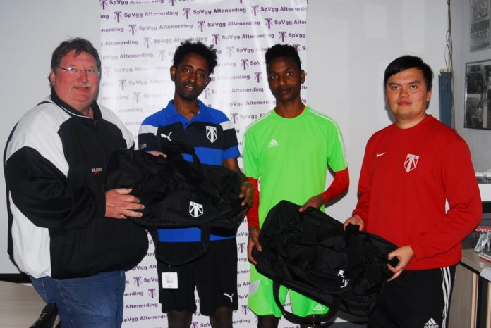 Die Integrationsarbeit wird in der Fußballabteilung der SpVgg Altenerding gelebt und bereits zahlreiche Flüchtlinge haben sich dem Verein angeschlossen und gehen in einer neuen Umgebung ihrem geliebten Hobby eifrig nach. „Wir freuen uns über jeden neuen Spieler, der den Weg zu uns findet, denn ich denke, dass eine Mannschaftsportart der ideale Begleiter für eine erfolgreiche Integration ist“, heißt Juniorenleiter Andreas Heilmaier die Flüchtlinge bei der SpVgg herzlich willkommen und zeigt sich zudem sehr dankbar, dass der Bayerische Fußballverband die Vereine bei dieser wichtigen Aufgabe großzügig unterstützt. „Die Egidius-Braun Stiftung des DFB fördert die wohlwollende Unterstützung der Flüchtlinge und Asylanten mit dem Projekt „1:0 für ein Willkommen“ und hat zahlreiche Fußballvereine in ganz Deutschland mit einer Finanzspritze von 500 € unter die Arme gegriffen. Der DFB ist somit ein sehr guter Partner, der den Vereinen kräftig unter die Arme greift“, verteilt Heilmaier an den DFB ein großes Lob. DFB-Präsident Reinhard Grindel schmückt aber auch die vielen Amateurvereine mit Lorbeeren. „Tausende Amateurvereine haben zehntausende geflüchtete Menschen zum Fußballspielen eingeladen. Der Fußball leistet dadurch einen bedeutenden zivilgesellschaftlichen Beitrag. Mit unserer Initiative soll ein wichtiges Anliegen der Amateurbasis erfolgreich und nachhaltig gefördert werden. Unser Budget war ursprünglich für 1.200 Vereine ausgelegt, doch jetzt haben sich mehr als 3.000 Vereine daran beteiligt und das ist eine stolze Bilanz der ersten Phase eines bemerkenswerten Projektes“, sagt der DFB-Präsident. Auch die SpVgg Altenerding bewarb sich im letzten Jahr für diese finanzielle Förderung und der Antrag wurde genehmigt, sodass die Veilchen aus den Händen von Kreisspielleiter Horst Kaindl einen entsprechenden Scheck übernehmen konnten. Die Altenerdinger Vorstandschaft hat das Geld direkt für Integrationsarbeit investiert. „Die neuen Mitglieder wurden beitragsfrei gestellt, denn wir wollen keinem Spieler aufgrund fehlender finanzieller Möglichkeiten den Zugang zu unserem Verein verwehren und zudem haben wir die jugendlichen Spieler mit neuen Sporttaschen ausgestattet, um ihnen den Einstieg zu erleichtern“, so Heilmaier. Die beiden A-Juniorenspieler Siele Habtom (2. v. links) und Makele Adhana (2. v. rechts), die beide aus Eritrea nach Deutschland gekommen sind, freuten sich über das Entgegenkommen der SpVgg und nahmen die Taschen aus den Händen des 2. Abteilungsleiters Rudolf Gandl (ganz links) und Juniorentrainer Florian Aldinger dankbar entgegen.