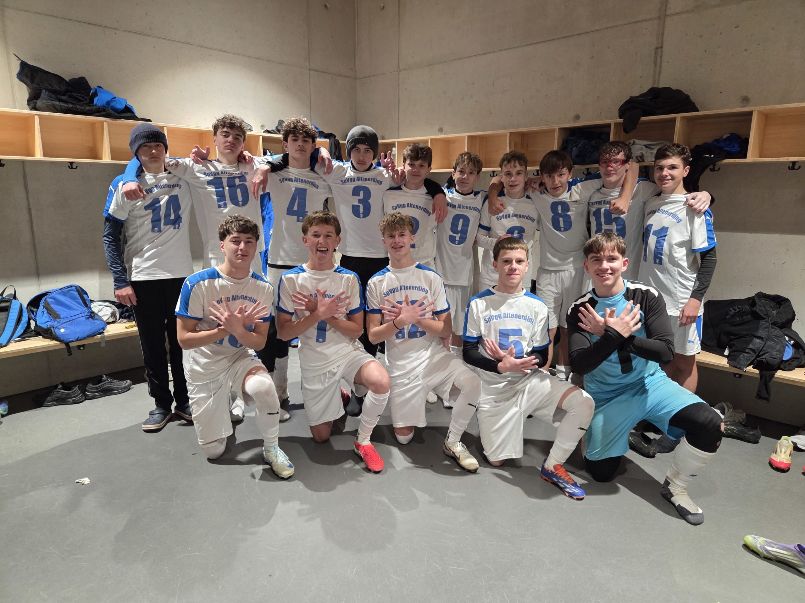 Bereits in der ersten Minute setzten die Veilchen ein erstes Ausrufezeichen, als im Mittelfeld der Ball erobert und auf Stürmer Nicolas Roith gespielt wurde. Dieser bediente den über die linke Seite in den Strafraum startenden Grin Bajoku, der sich gekonnt vom Abwehrspieler löste, doch sein Schuss ins linke Eck parierte der Berglerner Keeper. Die Altenerdinger waren in der Anfangsphase die spielbestimmende Mannschaft. Sie hielten das Tempo hoch und versuchten die gut stehende SVE-Defensive zu knacken. In der 18. Minute ein leichter Ballverlust im Spielaufbau. Ein Berglerner Mittelfeldspiele nutzte den Ballverlust und schickte mit einem mustergültigen Pass den schnellen Stürmer auf die Reise. Dieser konnte von Laurin Hesch vor der Strafraumgrenze eingeholt und bei seinem Schuss leicht gestört werden, so dass der Ball zentral vom herauseilenden SVA-Keeper Leonhard Kulterer geklärt werden konnte. Kurze Zeit später fiel das 1:0 für die Heimmannschaft. Vorangegangen war ein sehenswerter Spielaufbau über Danijel Aleksandric, der auf der rechten Seite den Flügelspieler Finn Backin bediente. Backin leitete an der rechten Strafraumgrenze auf Roith weiter, der Tom Schneider in der Strafraummitte anspielte. Schneider legte auf Leon Feuker ab, der aus gut 20 Metern das Leder mit dem linken Fuß ins rechte obere Eck hämmerte. Im weiteren Verlauf kontrollierten die SpVgg-Spieler das Spielgeschehen. Jeder Angriffsversuch wurde von den starken und hellwachen Defensivspieler Jannis Martin, Hesch, Imad Gazic, Aleksandric, Thomas Patri und Feuker zerstört. Trotzdem kam Berglern nach einem Foulspiel in Höhe der Mittellinie zu ihrer zweiten Chance. Der Freistoß wurde aus linker Position hoch in den Strafraum geschlagen. Keeper Kulterer unterschätzte den im Strafraum aufprallenden Ball, so dass dieser zum 1:1 im Tor landete. Verärgert durch den unglücklichen Ausgleich, gingen die Spieler in die Halbzeitpause und wärmten sich in der Kabine auf.