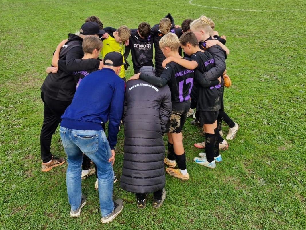 Beide Mannschaften gingen mit ziemlichen Elan in die Partie, und vor allem vor allem die Altenerdinger taten sich schwer, in ihre Zweikämpfe zu kommen. Man ließ der Heimmannschaft zu viel Raum und setzte diese zu wenig unter Druck. Aber wenn es dann schnell ging, taten sich Räume auf, die man dann auch konsequent bespielte. So auch in der zehnten Spielminute. Léo Dasch steckte das Leder tief auf Alessandro Cusati auf der rechten Seite durch, dieser behielt den Überblick und bediente in der Mitte Emilio Pomaroli. Dessen Schuss hatte der ansonsten stark aufspielende Goalie bereits sicher, doch dann glitt ihm der Ball durch die Finger und landete zur 1:0-Führung der SpVgg im Tor. Kurz darauf hätten die Veilchen den nächsten Treffer nachlegen müssen. Dasch setzte sich durch die Mitte durch, doch war sich dann nicht sicher, ob er selbst abschießen oder doch querlegen soll. Diese „Entscheidungskrise“ führte dazu, dass der Ball ins Nichts ging und eine gute Chance ohne Folgen blieb. Angepeitscht von den mitgereisten Fans gewann die SpVgg immer mehr Sicherheit. Der heute auf der 6er Position starke Felix Hartlmaier war aggressiv gegen den Ball und ließ den Ball immer wieder schön mit Unterstützung der beiden Innenverteidiger Niklas Braune und Ludwig Woitzik laufen. Nach 18 Minuten fing Alex Montag einen Ball auf der linken Seite ab, spielte mittig auf Mateo Rezvan, der zwei Gegenspieler stehen ließ und vorm Strafraum abzog. Doch leider wurde dessen Schuss im letzten Moment vom Abwehrspieler zur Ecke geklärt. Nach 21 Minuten hielt es auch Niklas Braune nicht mehr hinten. Zuerst setzte sich Léo Dasch über rechts durch und schloss ab, den Nachschuss nahm Niklas Braune direkt, doch leider ging das Leder knapp links vorbei. Kurz darauf kamen mit Lukas Ramm und Pablo Ahlschläger frische Kräfte auf den Platz. Drei Minuten vor dem Seitenwechsel konnte Léo Dasch wieder nicht gehalten werden und wurde unschön von den Beinen geholt. Den fälligen Freistoß brachte Mateo Rezvan flach gefährlich vor das Gehäuse, doch Alessandro Cusati verpasste nur knapp die Hereingabe. Nach 29 Minuten musste man auf der Altenerdinger Trainerbank tief durchatmen. Nach einem Missverständnis zwischen Ludwig Woitzik und Sebastian König, musste Letzterer unnötig in ein 1:1-Dribbling gehen, löste es jedoch in Manuel Neuer-Manier souverän. Die letzte Aktion der ersten Halbzeit gehörte noch einmal der Heimmannschaft aus Wartenberg. Nach einen tiefen Ball durch die Mitte war jedoch Sebastian König hellwach und entschärfte den Ball, indem er die Kugel ablief und aufnehmen konnte. Danach war Halbzeit in Wartenberg. Bisheriges Fazit: Grundsätzlich überlegen, doch leider oft zu hektisch, man braucht mehr Klarheit & Gradlinigkeit in den Aktionen.