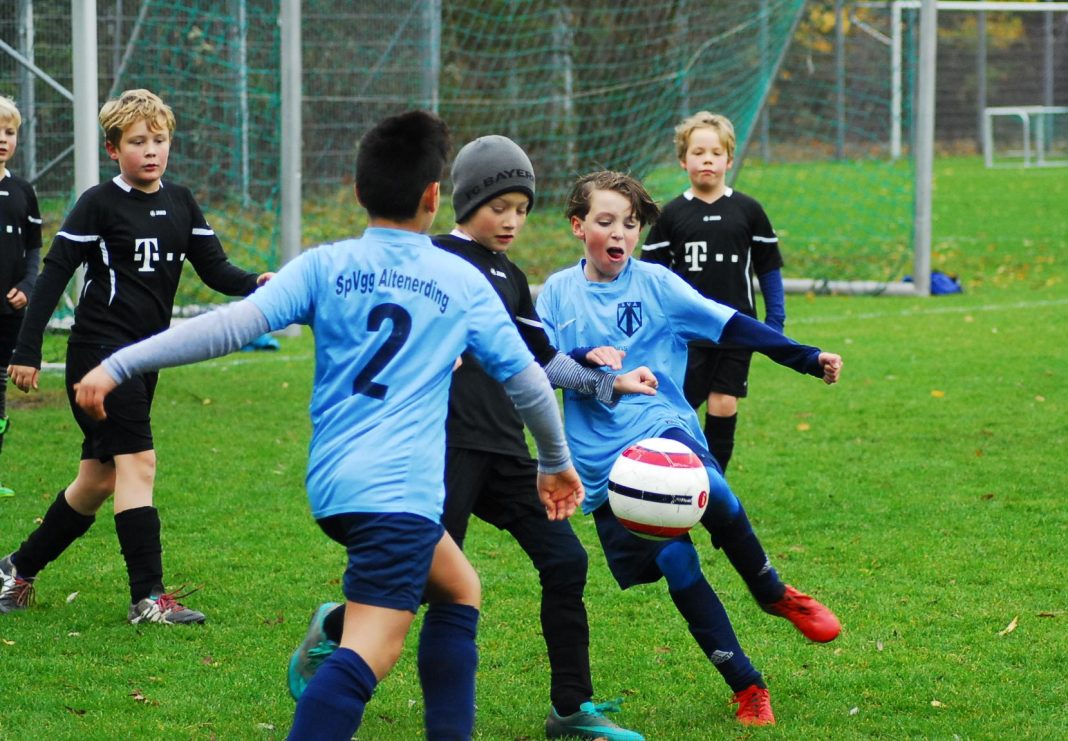 Knapp am ersten Saisonsieg schrammten die E4-Junioren am letzten Spieltag der Herbstrunde vorbei, denn im Heimspiel gegen die SG Reichenkirchen führte man bis zur Schlussminute mit 2:1, ehe man dann doch noch den Ausgleich hinnehmen musste. Die Veilchen waren von Beginn an hellwach und man war sofort überlegen, aber trotzdem lag die erste Möglichkeit auf Seiten der Gäste, doch bei einem Schuss reagierte der Altenerdinger Keeper glänzend und konnte das Leder glänzend an den Pfosten lenken. Nach neun Minuten glückte Reichenkirchen dann die Führung und die SpVgg hatte bei diesem Gegentreffer großes Pech, denn ein verunglückter Rettungsversuch von Maximilano Gonzalo landete unglücklich im eigenen Netz. Aber die Veilchen zeigten sich von diesem Rückstand wenig geschockt und fünf Minuten später hatte man schon den Torschrei auf den Lippen, doch ein schöner Schuss von Maximilian Schweinhuber verfehlte das Ziel knapp. Drei Minuten vor der Pause hoffte man dann abermals vergeblich auf das 1:1, denn diesmal ging ein Schuss von Gonzalo neben das Tor, sodass man mit einem knappen Rückstand in die Pause ging. Aber nach Wiederbeginn blieben die Veilchen am Drücker und schon nach drei Minuten brannte es wieder vor dem Gästetor, doch Dominik Beszedes traf das Leder nach einer Hereingabe nicht voll, sodass der Keeper der Gäste klären konnte. Wenig später kam dann Maximilian Schweinhuber im Strafraum zum Schuss, doch die Kugel ging knapp am Pfosten vorbei. Nun kam auch noch Pech hinzu, denn der SGR-Keeper konnte einen schönen Schuss von Beszedes mit einer hervorragenden Parade an die Latte lenken. Aber dann sollte der überfällige Ausgleichstreffer fallen, den ein Flachschuss von Beszedes rauschte unhaltbar ins Netz. Und nur zwei Zeigerumdrehungen weiter war man der Führung nahe, doch der Gästetorhüter konnte einen Schuss von Rappenplitz an den Pfosten lenken. Auf der Gegenseite hatte man dann Glück, dass ein Schuss um wenige Zentimeter am langen Pfosten vorbei ins Aus ging. Sechs Minuten vor dem Ende gingen die Platzherren dann endlich in Front und bei diesem Führungstreffer hatte man etwas Glück, denn ein verunglückter Schuss von Beszedes landete bei Maximilian Schweinhuber, der dann das Leder aus kurzer Entfernung über die Linie drückte. Dieser Rückstand war für die Gäste nochmals ein Weckruf, denn nun kam Reichenkirchen wieder besser ins Spiel. Drei Minuten vor dem Ende konnte der Altenerdinger Schlussmann Jakob Bieber mit einer Glanzparade den Ausgleich noch verhindern. Doch in der Schlussminute kam Reichenkirchen dann doch noch zum Ausgleich. Ein Angreifer zog von der linken Seite nach innen und ließ Bieber mit einem Schuss ins kurze Eck keine Chance, sodass sich die Veilchen mit einer Punkteteilung begnügen mussten.